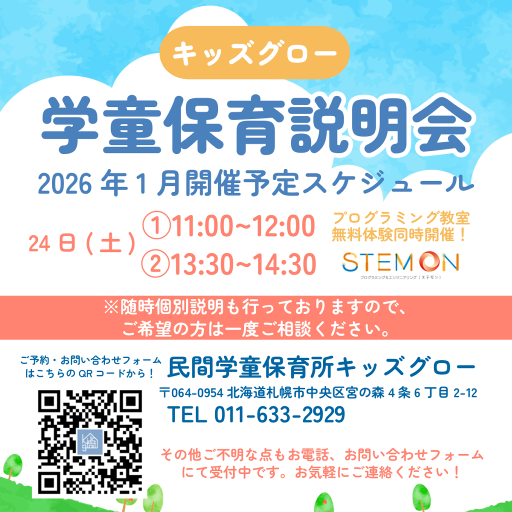 以下の日程で学童保育説明会とプログラミング教室体験会を行います。来年度、学童や習い事教室をご検討されている方は是非ご参加ください。