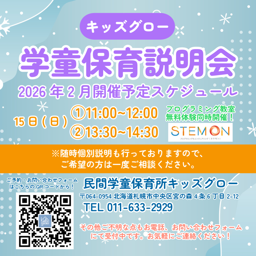 以下の日程で学童保育説明会とプログラミング教室体験会を行います。来年度、学童や習い事教室をご検討されている方は是非ご参加ください。