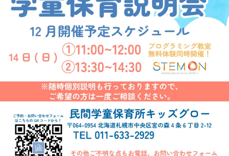 来年度の新規会員様のご入会受付が始まりました!来年度、学童保育のご利用をご検討されている方は、説明会にお越しください。習い事の送迎でお悩みの方、お預け時間が特殊な方などもご相談ください。施設内に習い事教室も併設しておりま […]