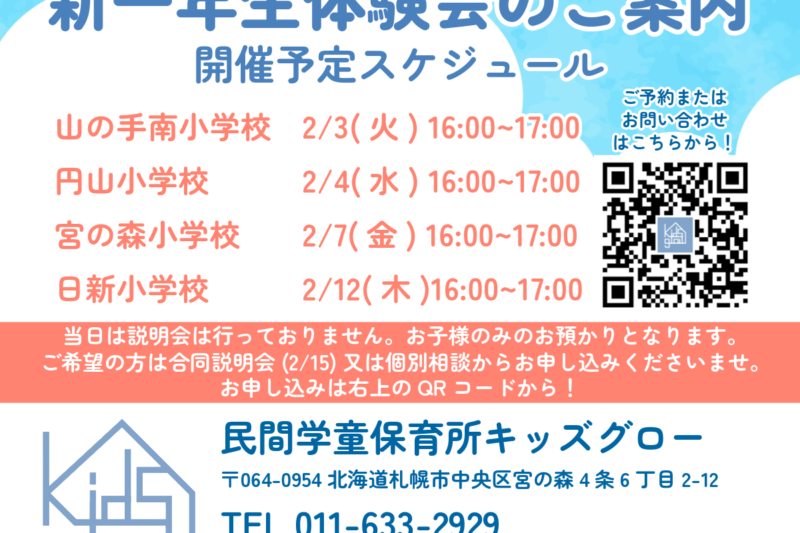 キッズグローは、民間学童保育施設です。宮の森小学校の隣りに2021年に開校し、お陰様で来年度は6年目を迎えます。利用するお子様たちが毎日楽しく安心して過ごすせるよう、日々尽力しております。 つきましては、施設のご紹介や活 […]